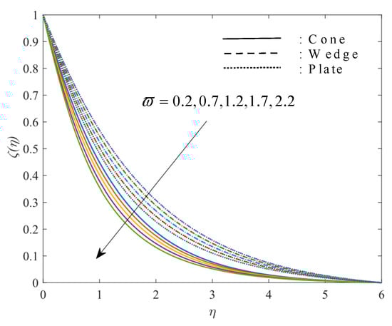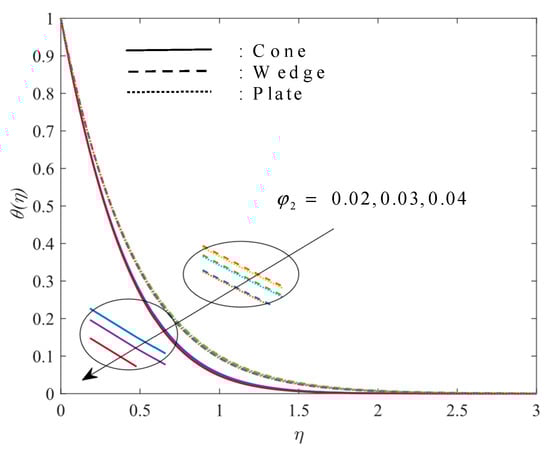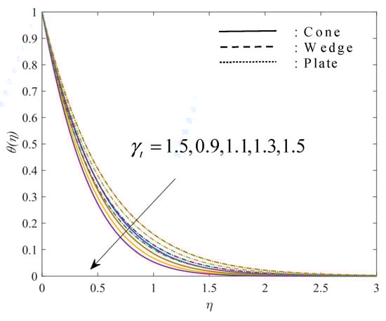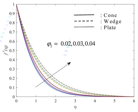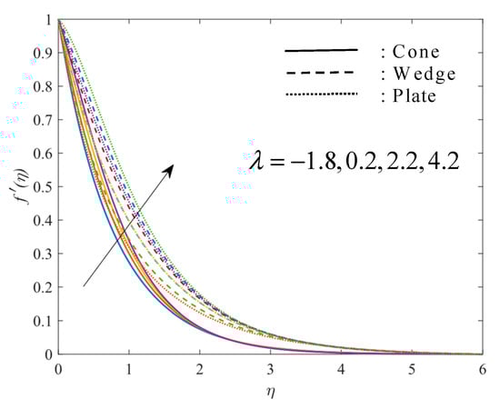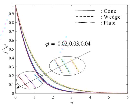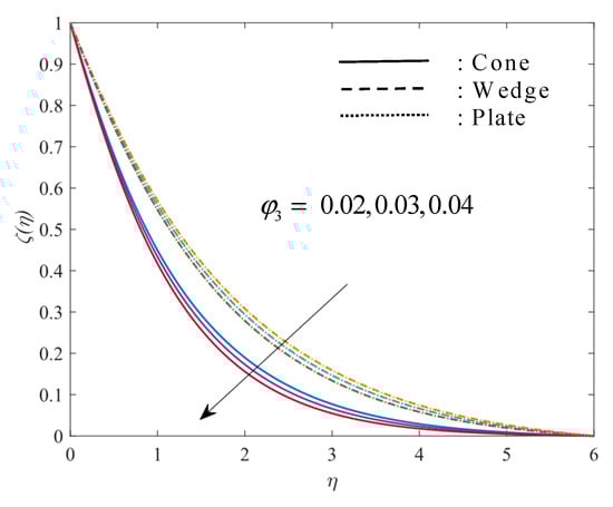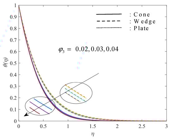 In Figure 3, Figure 4, Figure 5, Figure 6 and Figure 7, it is perceived that the velocity of THNF is highest for the flow toward the plate and is lowest for the flow toward the cone. The flat plate provides a plane and a smooth surface for the motion of the THNF, whereas the curved surface of the cone provides obstruction to the flow, and hence, for the cone, the velocity is lowest. The above results are also validated by the velocity boundary layer patterns and streamlines drawn in Figure 8 and Figure 9. Figure 8 and Figure 9 show the velocity boundary layer configuration and streamlines for the THNF flow toward the plate, wedge, and cone. The velocity boundary layer configuration in Figure 8 show that the flow toward the cone has lower velocity in comparison to the flow toward the plate and wedge. In addition, streamlines in Figure 9 also depict the same. It can be seen that for THNF flow toward the plate and wedge, the streamlines are narrow, whereas for the THNF flow toward the cone, the streamlines are wider. The wider streamlines depict that the velocity is low for the particular case.