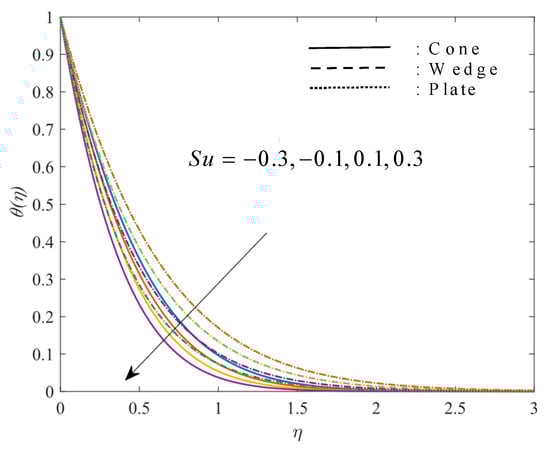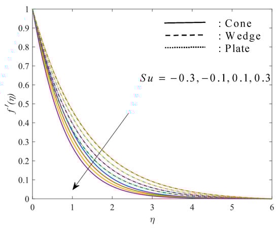 Figure 3, Figure 4, Figure 5, Figure 6 and Figure 7 show the influence of the natural convection parameter , NVF , and suction/injection parameter Su on the velocity , respectively. Figure 3 displays that the velocity of THNF rises with an increase in the natural convection parameter . The natural convection phenomenon is the mechanism of transportation of heat. This phenomenon causes THNF motion because of variation in fluid density, which occurs due to temperature gradients. The applications of natural convection can be seen in food and chemical industries and also in solar applications. In the present model, the increasing value of the parameter causes the buoyancy forces to increase and helps the velocity increase in all three cases (i.e., THNF flow toward a cone, a wedge, and a flat plate). Figure 4, Figure 5 and Figure 6 display the velocity of THNF with a rise in the NVF of the NPs. The increasing NVF of Al2O3 nanoparticles in the working fluid causes the velocity to decrease. In addition, the increasing NVF and of Cu and CNT nanoparticles results in an increase in velocity . The decrease in velocity due to an increase in NVF of Al2O3 nanoparticles is due to the spherical shape of these NPs, as the spherical shape has a larger surface area for interacting with other NPs, and due to this, the effective viscosity of THNF increases. Consequently, the velocity of THNF decreases with an increment in the NVF of Al2O3 nanoparticles. Figure 7 displays that the velocity of THNF drops with a surge in the numerical value of the suction/injection parameter Su. The application of suction/injection at the BLR has a central role in the boundary layer separation and is often used to delay the boundary layer separation.