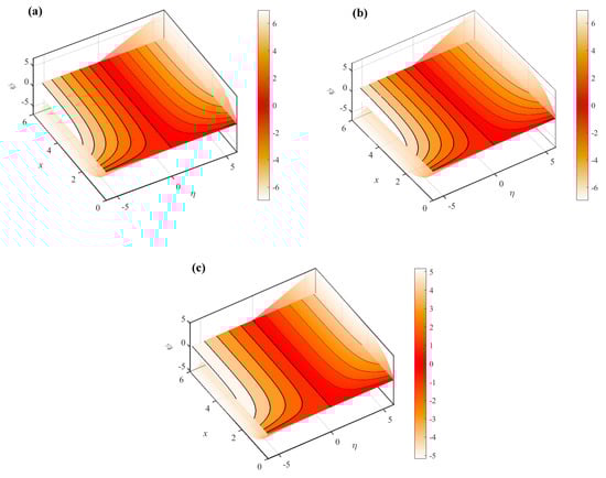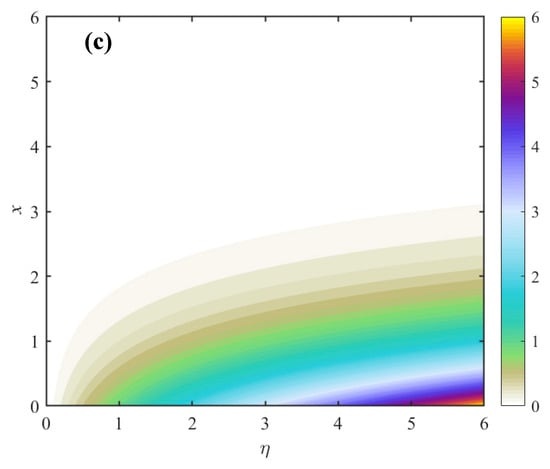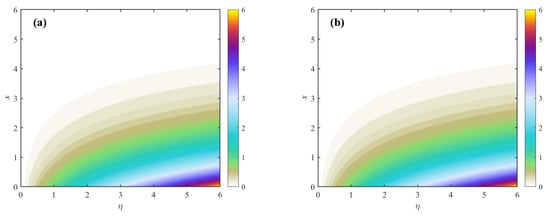 To have similar solutions of the Equations (9)–(12) with the BCs (Equation (13)), the term of x must vanish from these equations. It is noticed that the natural convection parameter appearing in Equation (9) when computed in the simplified form will be written as . Further, the BCs (Equation (6)) imply that surface temperature is in a variable form, as . So, further simplification will lead to the value of the natural convection parameter as . Therefore, a similar solution will exist only when because the term of x will vanish. For a similar solution to exist and for the computations of the results of this study, the value of the parameter related to surface temperature is strictly restricted to .