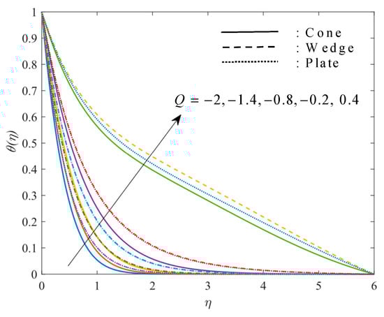 Figure 10, Figure 11, Figure 12, Figure 13, Figure 14 and Figure 15 show the influence of heat source/sink parameter Q, NVF , thermal radiation parameter Rd, suction/injection parameter Su, thermal relaxation parameter , and natural convection parameter on the temperature , respectively. Figure 10 displays that the temperature of the THNF is ominously affected by the heat source/sink parameter Q values. The temperature increases on increasing the value of parameter Q. The negative (Q < 0) and positive (Q > 0) values of parameter Q depict the mechanism of a heat sink and source, respectively.