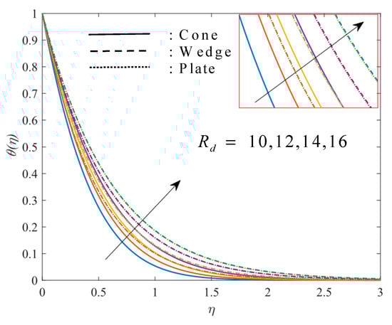 The results depict that on amplifying the magnitude of the heat sink in the model, the temperature of THNF flow falls. The reason for the falling temperature is that the heat sink absorbs the heat produced in the BLR during the flow, which results in a falling temperature. Figure 11, Figure 12 and Figure 13 display the temperature of THNF with a rise in the NVF of the NPs. The increasing NVF of Al2O3 nanoparticles in the working fluid causes the temperature to increase. In addition, the increasing NVF and of Cu and CNT nanoparticles results in a decrease in temperature . The increase in temperature due to an increase in NVF of Al2O3 nanoparticles is due to the spherical shape of these NPs, as the spherical shape has a larger surface area for interacting with other NPs, and due to this, the effective viscosity of THNF increases and a greater amount of heat is released. Consequently, the temperature of THNF increases with an increment in the NVF of Al2O3 nanoparticles. Figure 14 displays that the temperature of THNF surges with intensification in the radiation parameter Rd. This means that the radiation provides energy to the fluid particles, which surges their movement, and hence, the temperature rise. Furthermore, it is also seen that the temperature of the THNF is considerably affected by the radiation parameter Rd, which confirms its crucial role in the heat transmission process.
