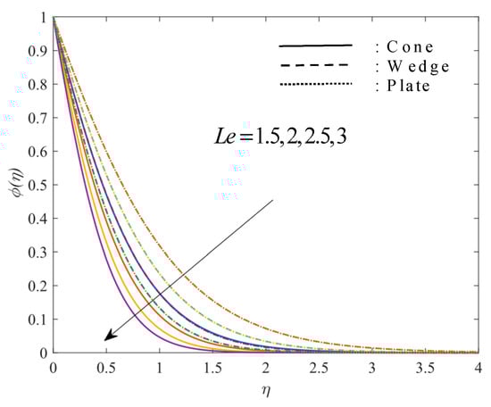 Figure 18, Figure 19 and Figure 20 show the influence of the Lewis number Le, suction/injection parameter Su, and solutal relaxation parameter on the concentration of NPs, respectively. Figure 18 shows the fall in the concentration of NPs with a rise in the Lewis number Le. The Lewis number Le is negatively correlated with molecular diffusivity. The increment in the Lewis number Le is seen as the lower molecular diffusivity. The lower diffusivity of the NPs in the BLR causes a fall in the concentration of NPs. Figure 19 displays that the NPs concentration is negatively correlated to the suction/injection parameter. Stronger suction at the surface destroys the flow and momentum, reducing the diffusivity of the NPs. Hence, the concentration falls due to the stronger suction.