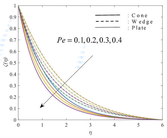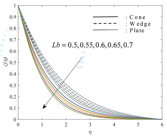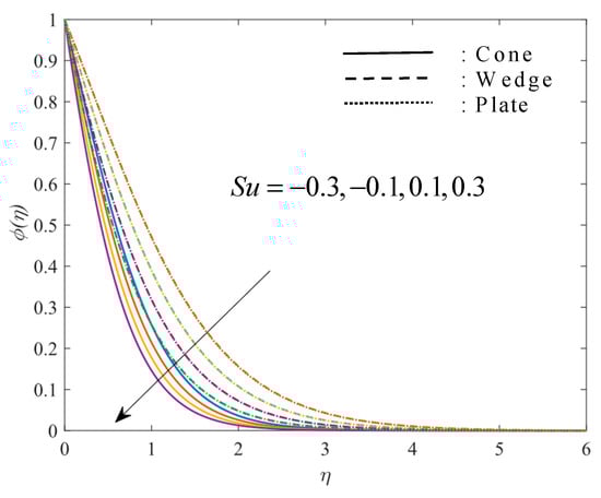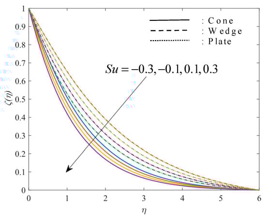 Figure 21, Figure 22, Figure 23 and Figure 24 depict the fluctuation of the microorganism concentration profile with the bioconvection Lewis number Lb, bioconvection Peclet number Pe, bioconvection constant , and suction/injection parameter Su. Figure 21, Figure 22 and Figure 23 show that the microorganism concentration profile falls with higher estimates of the bioconvection Lewis number Lb, Peclet number Pe, and bioconvection constant. The bioconvection Lewis number Lb is in charge of the system’s bioconvection. It increases heat diffusivity at the surface, lowering the density of microbes. It also diminishes the width of the boundary layer, which is proportional to the density of the motile microbe. Figure 24 shows that a rise in the suction/injection parameter Su causes the microorganism concentration profile to decrease. A stronger effect of the suction/injection parameter reduces the width of momentum and the NPs’ concentration boundary layer; as a result, the movement of layers and particles reduces, and it further causes the obstruction in the movement of the microorganism. Consequently, the microorganism concentration profile falls with increasing application of suction at the surface. In Figure 18, Figure 19, Figure 20, Figure 21, Figure 22, Figure 23 and Figure 24, it is observed that the concentration of NPs and microorganism concentration is highest for the flow toward the flat plate and is lowest for the flow toward the cone. The flat surface of the plate allows the smooth motion of the flow, and more and more diffusion of the NPs occurs; similarly, it also provides the smooth functioning of the microorganisms’ movement. However, the curved surface of the cone obstructs the diffusion of NPs and microorganisms’ movement; hence, these two profiles are comparatively low for the flow toward the cone.