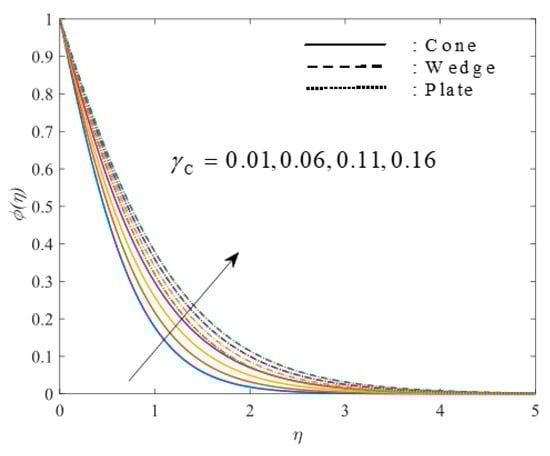 Figure 20 depicts the influence of the solutal relaxation parameter on concentration of NPs, and signifies the manifestation of lag in mass transfer. The zero value of parameter corresponds to the traditional Fick’s law for mass diffusion. The higher values of the parameter resemble the increased amount of time during the mass diffusion. Results depict that the higher estimates of parameter lead NPs’ concentration to rise.
