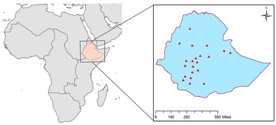Ethiopia is located in the center of the Horn of Africa (Figure 2). Its longitude range is 33°–48° E and its latitude range is 3°–15° N. Ethiopia is adjacent to Somalia and Djibouti in the east, Kenya in the south, Eritrea in the north and Sudan in the west. Ethiopia has a very complex terrain (Figure 2). More than 60% of its territory is 1000 m above sea level, the national average altitude is 2000–2500 m and there are also extinct volcanoes that are more than 3500 m high, and thus, it is called the “Roof of Africa” []. The East African Rift Valley divides Ethiopia into eastern and western parts. The western plateau is the main body of Ethiopia, and the terrain trend is from east to west; the southeast of Ethiopia is a low plateau with an altitude of 500–1500 m.