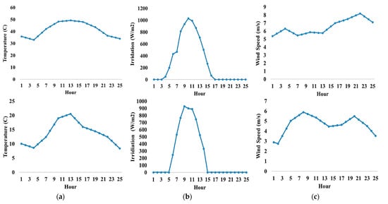 Daily summer (in the top) and winter (in the bottom) weather data for Basra (a) solar temperature, (b) solar irradiance and (c) wind speed.