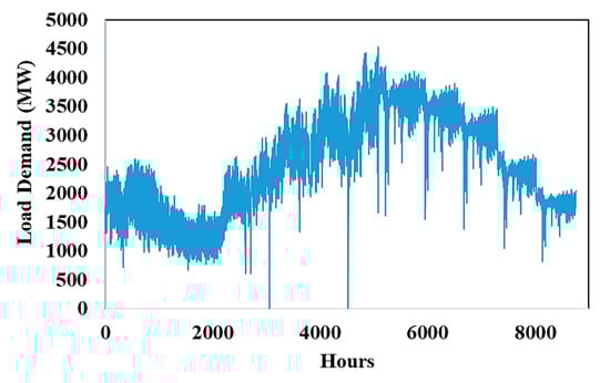 Basra’s power system is centralized and relies on five stations, one of which is thermal, and the others are natural gas, as shown in Figure 1 [53]. It participates in and is connected to the Iraqi network. Annually, with non-RERs, costs may be paid to cover operating and fuel expenses. This causes the network to face a number of challenges. Pollution and CO2 emissions can be generated from non-renewable stations, which are not adopted here as the paper focuses on simulating suggested RER-based off-grid MG to fulfill the load profile using the MATLAB-based optimal management of adopted energy sources without studying the power stations of the city, their associated costs, or any other data.