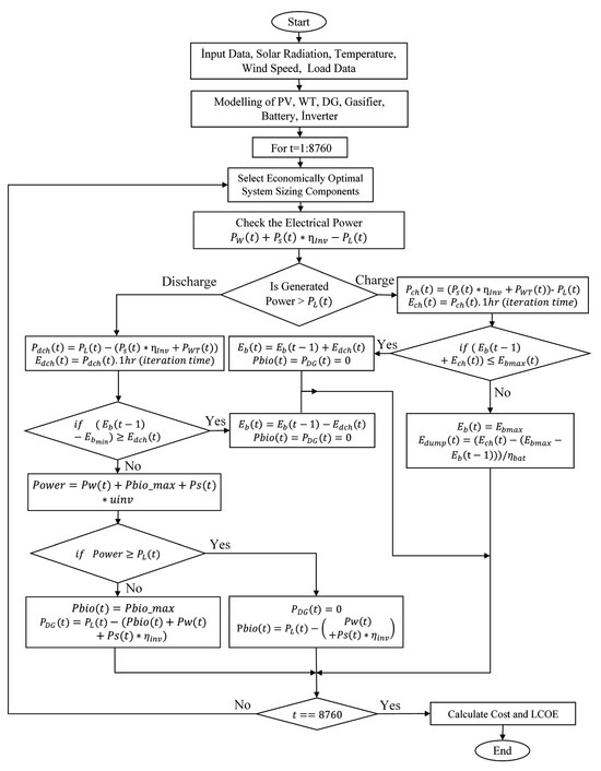 The proposed hybrid islanded MG system relies on solar PV, WT, biomass gasifier, battery units, with the diesel generator serving as a backup. First priority is given to renewable solar and wind energies to supply demand, followed by battery units to handle energy shortages. Then, if the available resources are insufficient to fulfill demand, a biogasifier energy source is utilized. Finally, a nonrenewable source (diesel generator) is employed if all adopted energy sources are deficient to meet demand. An optimal hybrid system size can be determined by considering the available RESs, the load at the chosen site, the economic and technical features of the hardware components, and the dispatch technique. The dispatch strategy or energy management algorithm have a significant impact on the optimal size and, as a result, on the post-optimization performance indicators. Since a load-following dispatch approach can reduce wasteful energy consumption and has cheaper LCOE and annual cost values, it is the focus of this research. Figure 6 shows the proposed operational energy management strategy. Figure 7 shows a pseudocode-based proposed energy management strategy.