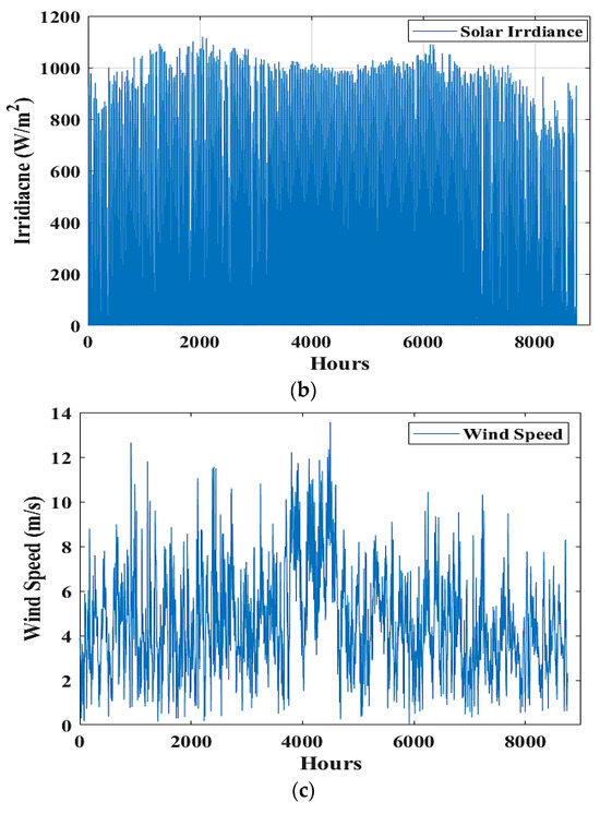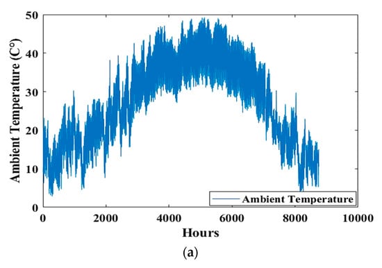 where represents solar PV output power, PV nominal power under normal test conditions is denoted by , solar radiation is denoted by , reference radiation is denoted by = 1 kW/m2, and is the power–temperatures coefficient (for monocrystalline and polycrystalline (Si) solar cells, it is [56,57]), = 25 °C is the standard temperature at standard conditions, and refers to the ambient temperature.