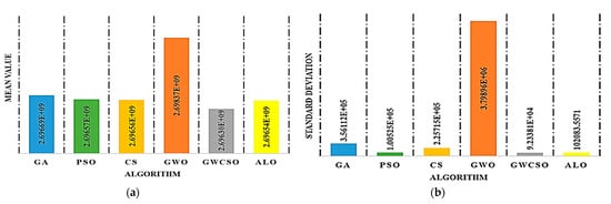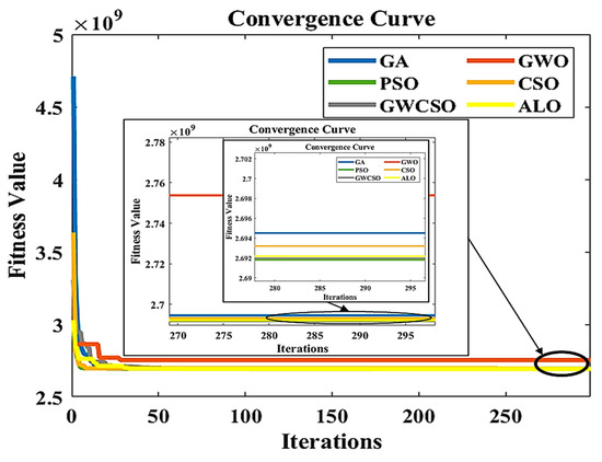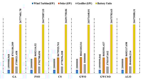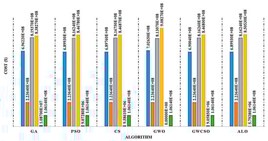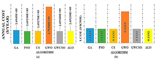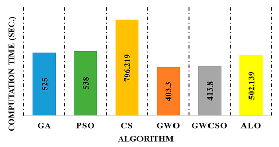 Each algorithm has been independently run twenty times to establish its stability. Figure 26 shows the average and standard deviation of annual cost values. It is clear that the GWCSO algorithm is superior to other algorithms because it displays the lowest amount of deviation, leading to a small deviation from the mean. It is evident that GWCSO produces a lower mean value = 2.6963 × 109 and standard deviation = 9.23381 × 104. Figure 27 illustrates the computation time required by each algorithm to determine the optimal sizing of system components. The optimal solution can be found quickly with the GWO, GWCSO, and ALO algorithms, as contrasted to the other algorithms. The computation time for the GWO, GWCSO, and ALO is 403.3 s, 413.8 s, and 502.139 s, respectively. The results indicate that the GWCSO outperforms its competition in both robustness and speed.