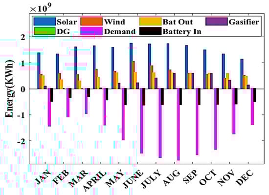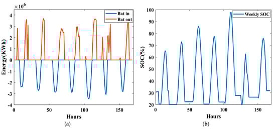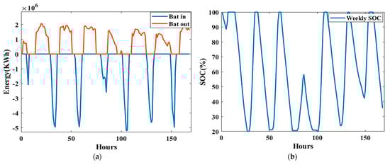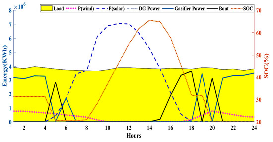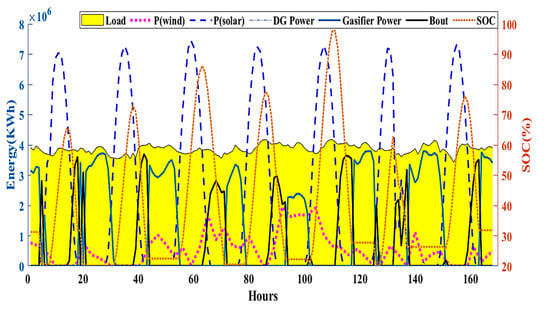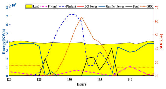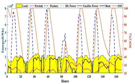 The results for the first week of the month of January are shown in Figure 23 (as a winter case study). The load demand is low during the winter months. Wind and solar energies are adequate to meet the demand in the interval (5 h–15 h) of the first day of January, as shown in Figure 24. These energies alone are insufficient to meet the demand, so the battery output (black curve) fulfilled the load demand at all other intervals. The bio-gasifier has not been utilized in the majority of winter days because the load demand is low and can be satisfied by wind, solar, and storage energy. Figure 25 illustrates the energy and average charge level of the battery for the first week of January. The SOC of the battery is verified to be within the acceptable range, proving that the proposed method has been properly sized.