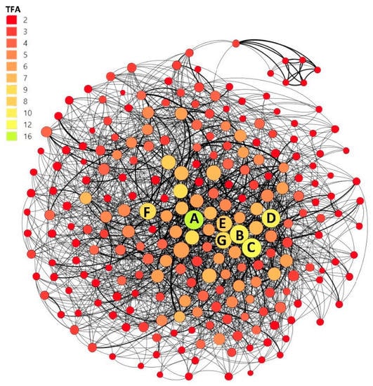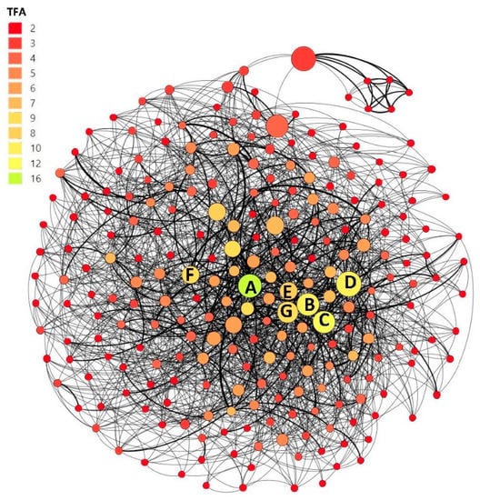 BC governs the size of the nodes. The bigger the size, the higher its BC. The thicker edges indicate larger weights between the nodes, meaning the actors collaborated in more than one film. The nodes with labels A, B, C, D, E, F, and G are the candidates of “Kevin Bacon”. The colors of the nodes denote their TFA; the brighter the color scheme, the higher the TFA. An amount of 84.77% out of 243 actors have a TFA of less than five and have smaller nodes (indicating lower BC). The two large nodes at the top part of the network have high BC but low TFA.