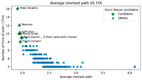 The first group is comprised of Pekin Ibrahim and Namron (actors A and C in Figure 2 and Figure 6). These actors stand out as exceptions because they have been in many films—16 and 12 movies, respectively (both of them are the candidate of “Kevin Bacon”). They may be acting with the same actors repeatedly, thus resulting in a lower BC compared to actors like Remy Ishak (also labelled as D) and Nur Fathiah Diaz, who have a higher BC (despite having a lower TFA than Pekin Ibrahim and Namron). Namron, who has a relatively high TFA, has a lower BC than Remy Ishak, Nur Fathiah Diaz, and Pekin Ibrahim.