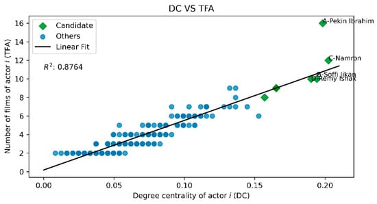 Figure 4 shows a linear relationship between the TFA and the DC. As the TFA goes up, so does the DC. The high coefficient of determination () also supports the variation in DC, which explains 87.64 percent of the TFA. The top four actors with high DC, whose names are labelled in Figure 4, have significantly higher DC than other actors but only a slight difference between them. There are a few differences, for example, A: Pekin Ibrahim is connected to 48 actors, B: Soffi Jikan is connected to 47 actors, C: Namron is connected to 49 actors, and D: Remy Ishak is connected to 46 actors, indicating that these four actors have a relatively similar number of connections with co-actors in the network despite differences in TFA.
