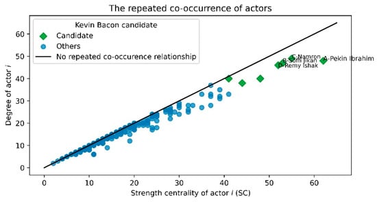 Figure 5 highlights that higher degree generally corresponds to higher SC. However, the actor with the highest SC is A-Pekin Ibrahim instead of the actor of highest degree C—Namron. Using degree, we can see that Pekin Ibrahim has worked with 48 different co-stars. His SC is 62, which means Pekin Ibrahim has 14 repeated co-occurrences with 11 actors. Meanwhile, Namron has worked with 49 different actors and his SC is 55 which means Namron has six repeated co-occurrences with six actors.