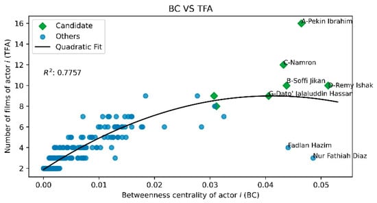 The high BC actors in the second group have relatively expected TFA based on the quadratic fit. Soffi Jikan, Remy Ishak and Dato’ Jalaluddin Hassan are these actors (actors B, D, and G, respectively, in Figure 2 and Figure 6) and also the candidates for “Kevin Bacon”. Remy Ishak has the highest BC as he is a connector for different co-actors from different types of movies in the network. He has worked in 10 films over five genres, one of which is an animation film. Thus, he connects voice actors with other actors from four different types of movies. Soffi Jikan has 10 films similar to Remy Ishak but with a lower BC, because Soffi Jikan only acted in three different genres, which are action (two films), comedy (seven films), and thriller (one movie). Therefore, he is only a connector for three different groups of actors. Meanwhile, Dato’ Jalaluddin Hassan has nine movies over six genres. Although he has acted in more genres than Soffi Jikan, his BC is lower. That means there are a smaller number of actors that depend on him to connect in the actor network compared to Soffi Jikan.