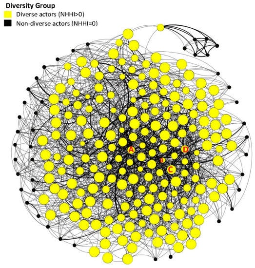 The actor network with nodes colored by their genre diversity group. The non-diverse actors are represented by black, while yellow represents diverse actors. Around 82.3 percent of the 243 actors are in the diverse group. The size of nodes signifies their NHHI value. The higher the NHHI, the bigger the size. The nodes with labels A, B, C, and D, are the actors from Table 3.