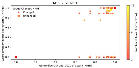 Figure 8 shows their NHHI(), which is computed based on their film(s) in year , plotted against their NHHI, which is computed based on the cumulative movies of an actor in year until 2020. Since TFA directly affects NHHI, we include it as the color of the scatter points. The brighter points are the actors with a high number of films. Note that the actors with a higher NHHI have higher genre diversity. This comparison shows two groups of actors: those that do not change their genre diversity (square), and the other group is those that have changed their genre diversity (star).