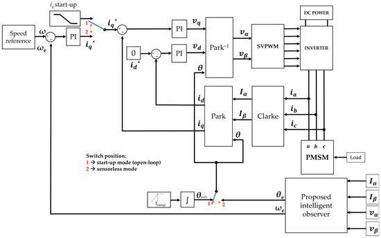 Sensorless PMSM-FOC control scheme process using a proposed intelligent observer.