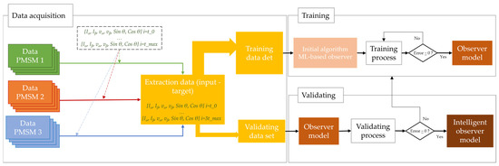 The proposed intelligent observer model was developed based on a machine learning development process [51]. Figure 4 illustrates the intelligent observer development process. Simulation data from several PMSMs with different parameters were acquired and used as training and validating data. The initial algorithm of the observer model did not have observer capabilities. Some simulation data extraction was used for the intelligent observer model’s training process, and other extracted data were used for the validation process. An intelligent observer model was formed at the end of this learning stage.