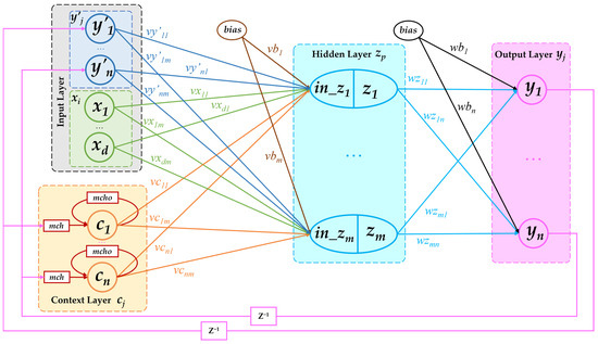where vbp is the bias of the hidden neuron, vy’jp is the weight between y’ (feedback from the output) and hidden neuron z, vxip is the weight between input x and hidden neuron z, and vcjp is the weight between context layer c and hidden neuron z. Equation (11) shows that the activation function used in zp(k) is the Tansig activation function [52]. Then the output of the network yj(k) is obtained using the following formula: