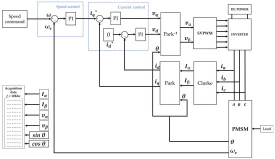 The sensorless PMSM drive system scheme used in this paper is shown in Figure 3 [33,39]. The PMSM mathematical model is often written as Equation (1). The voltages and are the voltages on the d-q axis, respectively, and the resistance is the resistance of each stator winding. In surface-mounted PMSM, , where and are the inductance values of the q-d axis; and are currents on the d-q axis; the rotating speed of the magnetic flux is symbolized by and the permanent magnet flux linkage is denoted by .