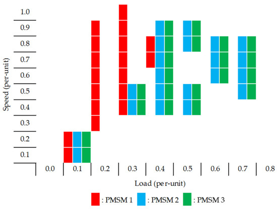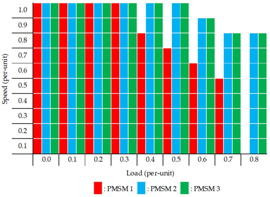 Speed command and load variations were applied during the simulation process for each motor. For training data, the combination of speed–load set-point variations is shown in Figure 7. Meanwhile, for validating data, the combination of speed–load set-point variations is shown in Figure 8. In the current investigation, to make the computational process as efficient as possible, a per-unit system, also known as a p.u system, was utilized to scale the international value system of units or SI as p.u-values ranging from −1 to 1. For example, if the motor’s maximum speed is 6000 rpm, 3000 rpm of the motor speed becomes 0.5 p.u speed, and −0.8 p.u speed means 4800 rpm in the reverse direction [54].