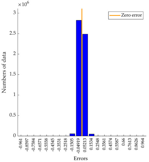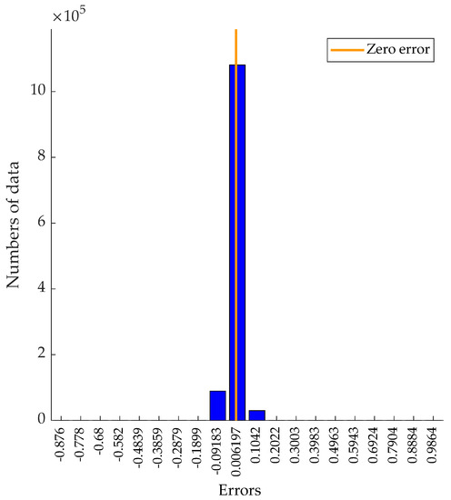 All three PMSM simulation data acquired were combined and used to train the initial model of the MJNN. The total data training comprised 2,708,576 rows of data. The offline training process was performed with learning rate = 0.002, and after 27,347 epochs, the final MSE value reached 5 × 10−6. At the end of the training process, the final values of weights and biases were stored as the model’s core. In order to validate the model, another 600,000 rows of simulation data were used. The histogram errors of both the training and validating process are shown in Figure 9 and Figure 10. From these two error histograms, it can be concluded that the MJNN model can respond well to the input given.