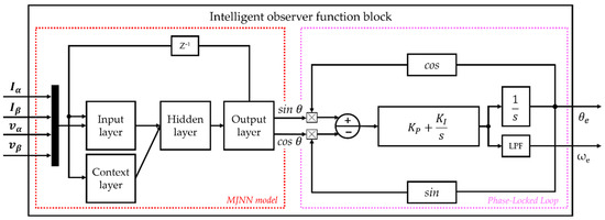 This paper proposes an intelligent observer. The novelty of the proposed intelligent observer is its compatibility with several PMSMs with different parameters and a shorter calculation time process. A trained modified Jordan neural network (MJNN) is used as the observer’s core. Figure 2 shows the MJNN configuration.