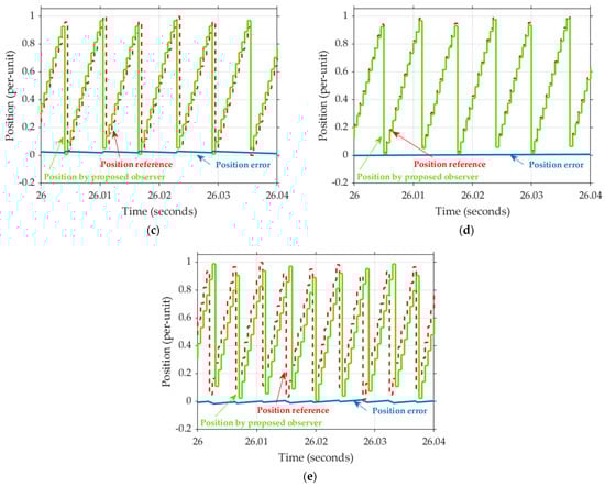 Based on Figure 11, the proposed observer generated rotor position and speed feedback information. Figure 12 shows the simulation result samples for the rotor position generated by the proposed observer compared with the position reference. Figure 12a–c are the results for the learning source PMSMs. Figure 12d,e are for non-learning PMSMs. Table 3 shows the average position error for each PMSM. The rotor positions generated by the observer have small errors compared to the position reference, 0.0078 p.u on average. This fact confirms that the observer can generate rotor position information correctly.