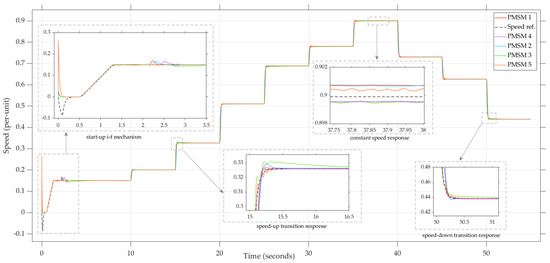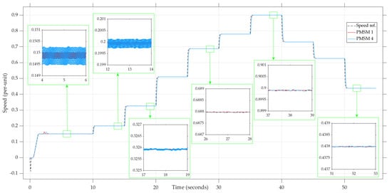 Speed feedback information generated by the proposed observer is discussed in this sub-section. The simulation used per-unit speed values, and just two PMSM simulation results were used as a representation. This was to make the performance comparisons clear. In the control simulation, by using the I-f start-up mechanism, the motor started in open-loop mode and then switched to the closed-loop sensorless mode. The proposed observer was used during this sensorless mode. Figure 13 shows the comparison of speed reference and speed feedback information generated by the observer for PMSM 1 (as a learning source PMSM) and PMSM 4 (as a non-learning source PMSM). The speed feedback from the two PMSMs control processes could smoothly follow the speed reference, as shown in Figure 13. In more detail, for low, middle, and high-speed ranges, the proposed observer had a better speed feedback response for PMSM 1 than for PMSM 4. However, because the gap was very small, there was no significant difference in the overall PMSM control process. It can be emphasized that the observer performs well in generating speed feedback information.