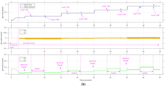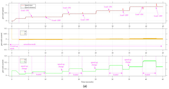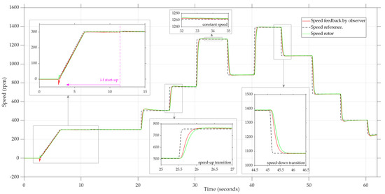 Figure 18 shows in the sensorless mode, the proposed observer produced speed feedback information close to the speed reference. This occurred in all control conditions: the constant speed, the speed-up transition, and the speed-down transition. This fact means the rotor speed can follow the speed reference as well. It can be emphasized that, in the experimental hardware, the proposed observer worked well in terms of speed variation control.