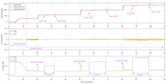 In this sub-section, we aim to uncover the speed and d-q current characteristics in response to the load addition in the real hardware implementation. The load was given at low, medium, and high speeds. Figure 19 shows the results. For the speed characteristic, there were speed spikes down when the load was ON and up when the load was OFF. This shows that, despite the PI control speed settings, the observer properly generated speed feedback information in the load-ON and load-OFF conditions.