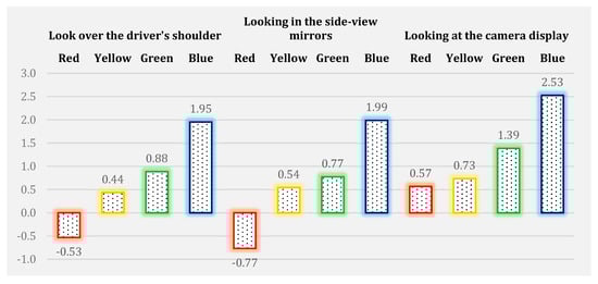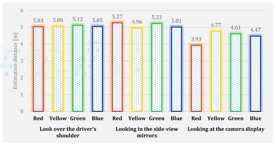 - There are differences for blue, green, yellow, and red colors in a situation when the driver estimated the distance of the object by looking at the object over driver’s shoulder and at the camera display;
