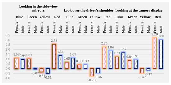 Using an independent samples t-test, the estimation of the distance of the object depending on the participant’s gender was analyzed for all described conditions and colors of the object (Figure 8). The results showed statistically significant gender differences in men (M = 5.568; SD = 1.864) and women (M = 4.492; SD = 1.796) for estimating the distance of the green object (t = −3.525; p = 0.001), in men (M = 5.636; SD = 2.108) and women (M = 4.473; SD = 1.561) for estimating the distance of a red object (t = −3.951; p = 0.000) in the situation when the driver estimated the distance by looking in the side-view mirrors, in men (M = 4.906; SD = 1.371) and women (M = 5.346; SD = 1.289) for estimating the distance of the blue object (t = 1.992; p = 0.049) in the situation when the driver estimated the distance by looking over the driver’s shoulder, as well as in men (M = 4.335; SD = 1.437) and women (M = 4.773; SD = 1.203) for estimating the distance of the blue object (t = 2.037; p = 0.044) in the situation when the driver estimated the distance by looking at the camera display.