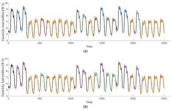 The case of in Table 1 is the most common in practical applications, that is a one-step-ahead rolling forecast. As discussed in sec:HMMGPFR, when making a rolling prediction, HM-GPFR and BHM-GPFR can dynamically adjust the model incrementally after collecting new data without retraining the model. The results of the one-step-ahead rolling prediction of HM-GPFR and BHM-GPFR on the electricity load dataset are shown in Figure 4. It can be seen that the predicted values of HM-GPFR and BHM-GPFR were very close to the ground-truths, indicating that they are effective for rolling prediction. In the figure, the color of each point is the weighted average of the colors corresponding to each mode in Figure 3 according to the weight . Note that there are color changes in some electricity load curves in Figure 4a,b. Taking the time series in Figure 4a in the range of about 1100–1200 as an example, when there are few observation data on that day, HM-GPFR believes that the electricity load evolution pattern of that day is more likely to belong to Mode 3. With the gradual increase of observation data, the model tends to think that the electricity load evolution pattern of that day belongs to Mode 5 and then tends to Mode 3 again. This shows that HM-GPFR and BHM-GPFR can adjust the value of in a timely manner according to the latest information during the rolling prediction.