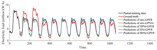 Figure 6 further shows the results of the multi-step prediction of these methods on the electricity load dataset. Here is also the case of “cold start” (), and we predicted the electricity loads in the next 10 days (960 time points in total). It can be seen from the figure that these methods can effectively utilize the periodic structure in the time series; the prediction results showed periodicity, but the prediction results of HM-GPFR and BHM-GPFR were slightly different from the other methods. Due to the problem of the “cold start”, the predictions of mix-GPFR, mix-GPNM, and DPM-GPFR for each day were the same, i.e., , while HM-GPFR and BHM-GPFR use coarse-grained temporal information when making predictions and then adjust the predicted values of each day. Based on the predicted values of the other methods, it can be seen from the figure that the predicted values of HM-GPFR and BHM-GPFR on the first day were higher, and with the increase in step size, the predicted values will tend to the weighted average value of the mean function of each GPFR component.