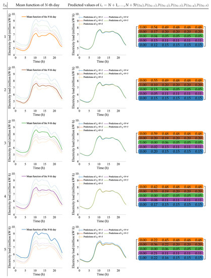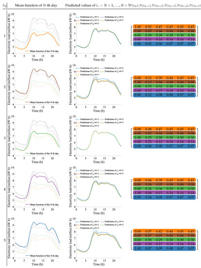 In order to more clearly see the role of the Markov chain structure of hidden variables in the cold start setting, in Figure 7 and Figure 8, we show the predicted values of HM-GPFR and BHM-GFPR for electricity load in the next five days and the distributions of the latent variables conditioned on . It can be seen from the figure that HM-GPFR and BHM-GPFR have different predictions for each day’s electricity load, which will be adjusted according to the transition probability of the evolution law. For example, in Figure 7, when , the power load on that day is low, and the predicted value of HM-GPFR on the -th day is also low. When , the electricity load on that day is higher, and the predicted value of HM-GPFR on the -th day is also higher. Figure 8 has a similar phenomenon. In addition, it can be seen that, with the increase of , quickly converged to the stable distribution of the Markov chain, and the predicted value also tended to be the weighted average of the mean function in each GPFR component. In conclusion, these phenomena demonstrated that HM-GPFR and BHM-GPFR can effectively use the coarse-grained temporal structure to adjust the prediction of each day.
