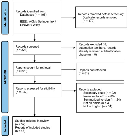 To collect the published papers about the modeling languages for IoT, we followed the screening and reviewing process depicted in Figure 1 which is based on the Preferred Reporting Items for Systematic Reviews and Meta-Analyses (PRISMA) guideline [80]. In the first stage (identification), we scanned the digital databases (IEEE, ACM, Springer-link, Elsevier, and Wiley) that enable access to the journal and conference publications and found 495 papers about the modeling languages for IoT. To obtain the papers (i.e., records in Figure 1), we used many keywords on Google, and some important ones are as follows: (1) modeling languages IoT; (2) IoT-based modeling languages; (3) IoT modeling; (4) model-based (and -driven) engineering in IoT; (5) metamodeling IoT; (6) survey on IoT modeling; (7) practitioners modeling IoT; and (8) analysis of modeling languages IoT. Having obtained 495 different records with the keywords given above, we then examined and filtered the records whose duplicates are available in our list. So, we removed 172 duplicate records whose titles were the same as some other existing records but had been published in different databases. We ended up with 323 records that could then be considered as reports, each of which represented a document supplying information about a particular study. Reports could be a journal article, preprint, conference abstract/paper, study register entry, dissertation, unpublished manuscript, or any other document providing relevant information. On the other hand, a record is the title or abstract (or both) of a report indexed in a database or a website.