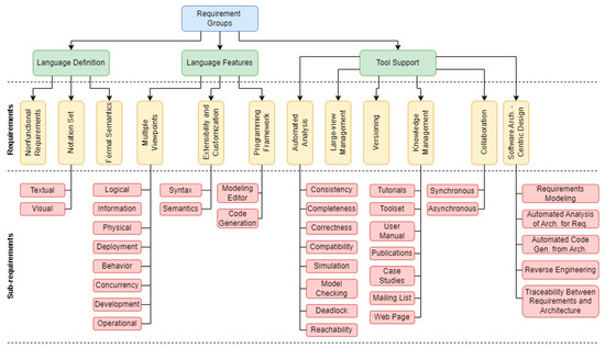 Language features are considered in terms of three requirements: (1) multiple viewpoints, (2) extensibility and customization, and (3) programming framework. Multiple viewpoint support is to do with the separation of concerns for managing the complexity of software systems. Each viewpoint focuses on a particular concern and enables modeling for that concern only (e.g., separating models in accordance with the logical, information, physical, deployment, behavior, concurrency, development, and operational viewpoints) [76,77,78]. Extensibility and customization are to do with extending languages with some desired capabilities such as domain-specific elements, analytics support, and support for different views. In this study, two different extension mechanisms, syntax and semantic extensions, are discussed [79]. The programming framework is concerned with the support for any framework that can facilitate the specification, analysis, and transformation of software models.