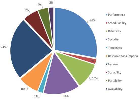 As shown in Table 2, many modeling languages for IoT support the specifications of one or more nonfunctional properties such as performance, safety, reliability, availability, plannability, and resource consumption. Figure 3 shows the percentages of the languages that support each type of nonfunctional requirements indicated in Table 2 (i.e., the division of the number of languages that support each type of nonfunctional property by the number of languages supporting the nonfunctional properties). The most supported nonfunctional properties are performance (28%), security (14%), and reliability (10%). Note that 24% of the languages support the specifications of any type of nonfunctional properties via the use of aspects and formal methods.
