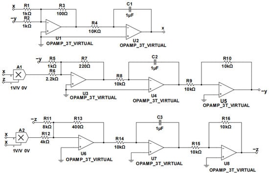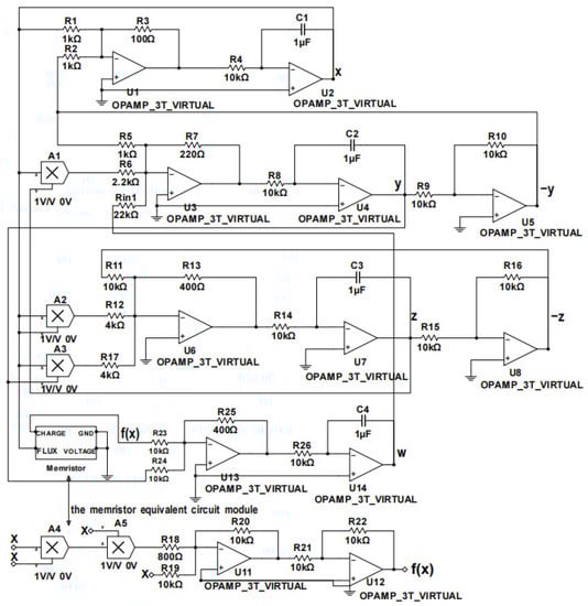 Circuit implementation diagram of the memristor-based hyper-chaotic Bao-like system.