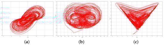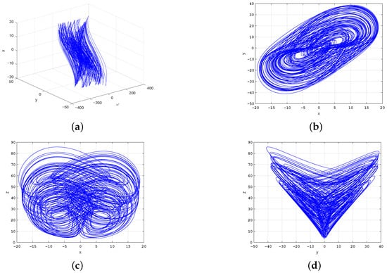 In order to make system (5) exhibit chaotic dynamics behavior, let the parameters , , , , , and . The chaotic attractor phase diagram of the memristor-based hyper-chaotic Bao-like system with the initial condition is shown in Figure 2, where Figure 2a, Figure 2b, Figure 2c, and Figure 2d, represent attractor phase diagrams of the x-y- plane, x-y plane, x-z plane, and y-z plane, respectively.
