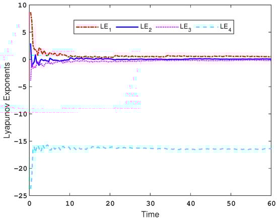 The concept of the Lyapunov exponent was first introduced in [38] and can be used to characterize the motion of the system. When a system contains no less than one positive Lyapunov exponent, it can be determined whether it is chaotic [39]. The Lyapunov exponents of system (5) can be calculated by using the Wolf method in [38], and Figure 3 shows the Lyapunov exponential spectrum of the hyper-chaotic system. To show more clearly, combined with the data analysis in Table 1, the Lyapunov exponents that , , , and can be obtained respectively. The Kaplan–Yorke dimension [40] of the hyper-chaotic system is defined as: