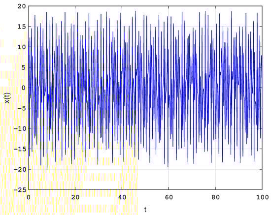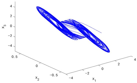 with the piecewise linear function , in which Figure 8 shows that Chua’s oscillator with the initial condition produces a chaotic phenomenon.