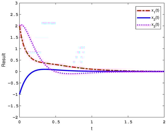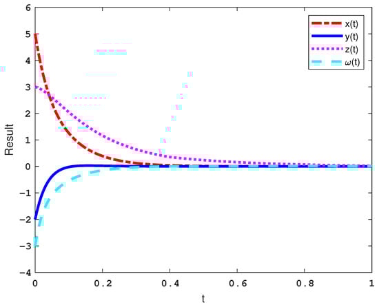 Thus, by the results obtained above, it can be concluded that the validity of Theorem 1 is proven. Besides, the time response curves of the controlled system with periodically intermittent control with variable control width are shown in Figure 7.
