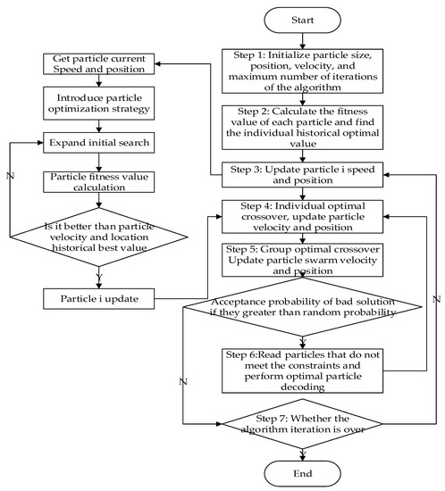 Strategies adopted in the improved PSO include: (1) The convergence speed improvement strategy. We mainly test the basic set of the algorithm and dynamically adjust the parameters in the algorithm settings, such as inertial weight and cognitive constants and , combined with the influence of parameters on the search accuracy and range of the algorithm particle swarm. (2) Particle dynamic search improvement strategy. The particle optimization formula is introduced, and the optimal solution is searched via the intersection of the particle with the individual extreme value with the group extreme value, the particle self-mutation, and the optimization method. (3) Elite retention and improvement strategies. Several bad solutions that do not meet the constraints in the particle intersection can be accepted to help the particles jump out of the local optimum.