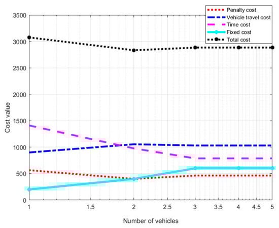 This simulation sensitivity analysis experiment is a controlled variable experiment. Under the premise of controlling other basic parameters unchanged, first, the number of vehicles in the distribution center (1–5 vehicles) are adjusted, then we analyze the influence of the number of vehicles on the objective function value in the model, and obtain the optimal number of delivery vehicles. The specific simulation results are shown in Table 11. The solution space schematic, corresponding total cost and various cost change curves are shown in Figure 2 and Figure 3.