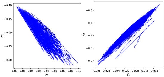with and . and . As a result, system (33) has a chaotic attractor with initial condition , , , , as shown in Figure 2.