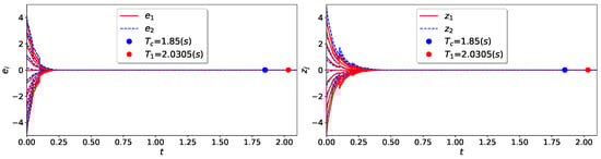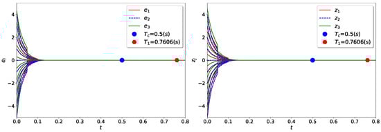 For , consider the drive–response systems (35) and (36), given in Example 2, via controller (26). Here, , , , and , and the other parameters are the same as those given in Example 2. Thus, according to Theorem 2, the drive–response systems (35) and (36) have a synchronized PDT of less than and under controller (26), as shown in Figure 6.